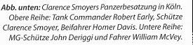 So schön es auch ist, daß Rheindorf als unbestrittene Höhepunkte seiner langjährigen Recherchen auch die Namen von einigen Soldaten im Panther und im Sherman heraus gefunden hat, so traurig ist es auf der anderen Seite aber auch, daß er aber noch nicht einmal 2 Soldaten aus dem Pershing, deren Namen bereits seit jeher bekannt sind, richtig auseinander halten kann. An zwei Stellen seines Buches zeigt er das bekannte Foto der Besatzung auf dem Pershing nach dem erfolgten Abschuß des Panther, welches ein Standbild aus dem Film von Kmeramann Rosenmann ist