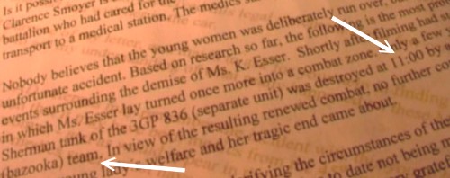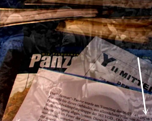 | Es gibt einige Diskrepanzen zwischen unseren Recherchen und den in diesen Filmen dargestellten Geschichten. Insbesondere weisen wir die Theorie eines "trojanischen Panzers" und die Theorie, daß Kathi Esser von einem amerikanischen Panzer überfahren wurde, zurück. In beiden Fällen handelt es sich um eine Verwechslung.
