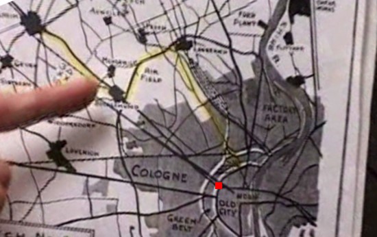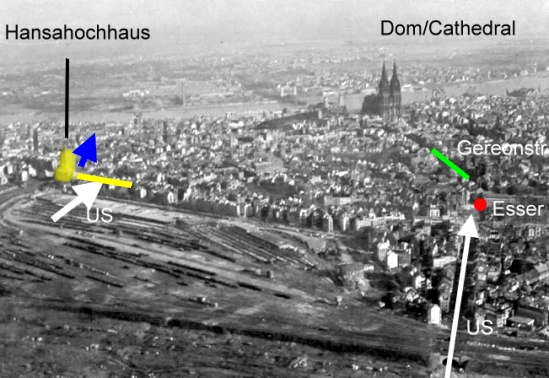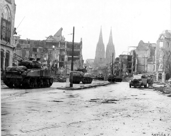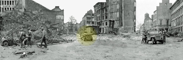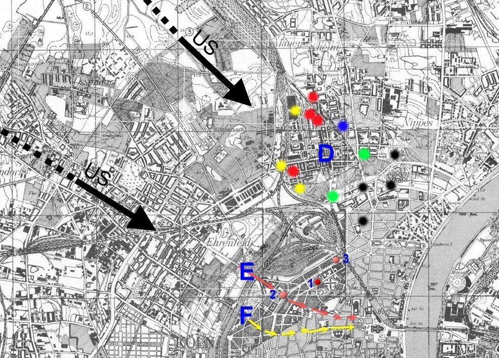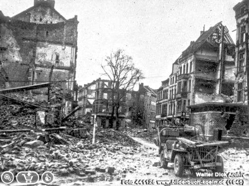 Es handelt sich um die Zeit, als die US Truppen im Bereich des Autos eintreffen. Der Schwenk geht von Westen (aus Richtung Gladbacher Strasse) über die nördlich gelegene Einmündung Von-Werth-Strasse Richtung Osten (in Richtung Gereonstrasse / St. Gereon.