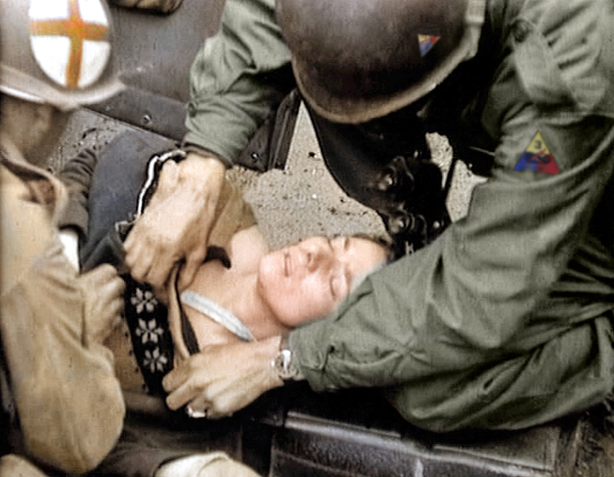 Auf der DVD wird im folgenden aber auch noch dargestellt, daß die junge Frau im weiteren Verlauf der Geschehnisse nach der scheinbaren Beruhigung der Situation im Rahmen einer plötzlichen doch noch wieder aufflammenden Kampfsituation (Beschuss der amerikanischen Truppen mit einer Panzerfaust aus einem Haus) versehentlich von einem amerikanischen Panzer überollt und getötet wurde. Ob dies tatsächlich so war, wird später noch ein Thema auf dieser Seite sein.