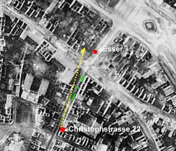 Eingezeichnet die Positionen der drei Autos in der Christophstrasse am 6. März 1945. Blauer Punkt - der Wagen von Katharina Esser, roter Punkt der zerstörte Wagen mit den Leichenteilen davor, schwarzer Punkt der dritte Wagen mit dem toten Fahrer, schon etwas weiter Richtung Gereonkirche positioniert.