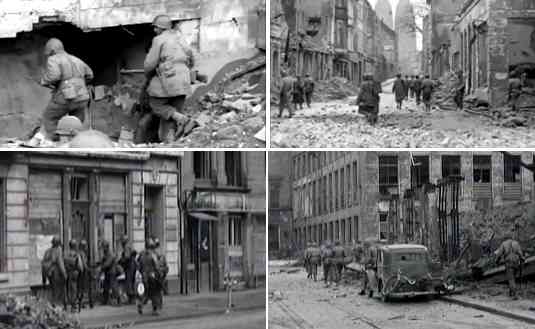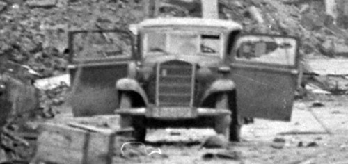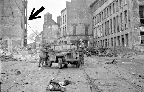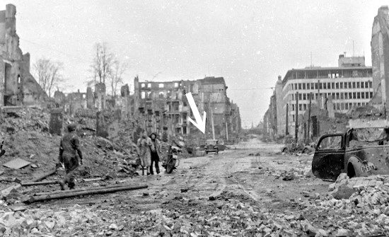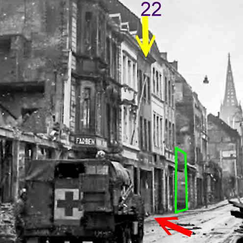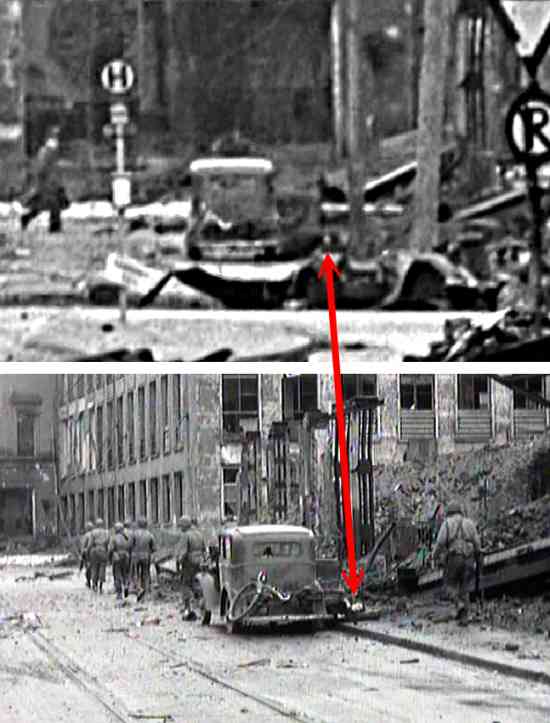 Die entsprechende Filmaufnahme erfolgte ungefähr von der Position aus, an das Auto der Katharina Esser stand. Sichtbar auch Schutt auf der Strasse, der nach dem Beschuß der dortigen Häuserfronten durch den Pershing auf die Strasse gefallen war.
