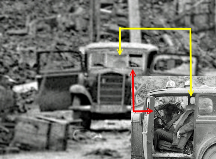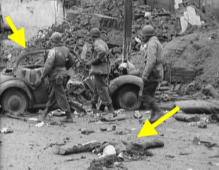 Bild oben, während des Beschusses der Häuser liegt die Frau neben dem Auto, man sieht den Kopf und den dunklen Körper inklusive Beine unter dem Auto. Genau so liegt sie auch beim späteren Eintreffen der US-Soldaten am Auto, Bild unten.