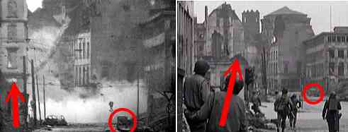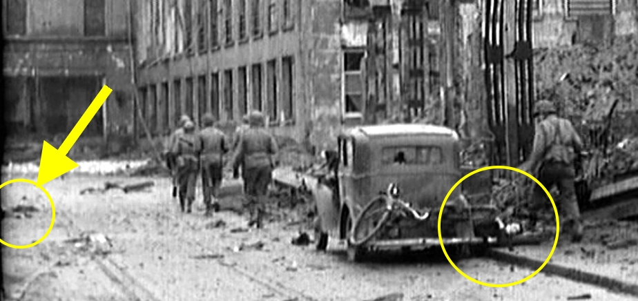 Die Amerikaner lassen ihren Führungspanzer, den Pershing, auf die Häuserfronten der Christophstrasse schießen, um den deutschen Panzer IV zu treffen oder zu verschütten. Der Wagen der jungen Frau steht während dieser Kampfhandlungen bzw. des Beschusses durch die Amerikaner immer noch an der rechten Strassenseite (weißer Pfeil). Im Film nicht mehr zu sehen, aber auch die links noch sichtbare Hausfassade an der Ecke Christophstrasse / Von-Werth-Strasse wird bei weiterem Beschuss noch mit Getöse einstürzen, sie steht noch näher an dem PKW und wird beim Einsturz sicher auch noch eine Staubwolke Richtung PKW ziehen lassen.