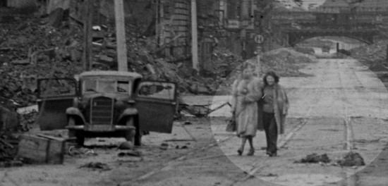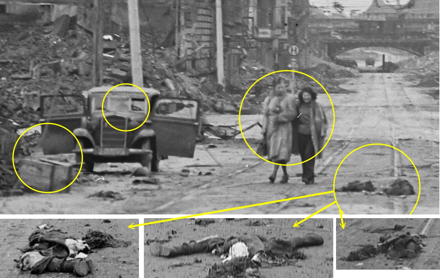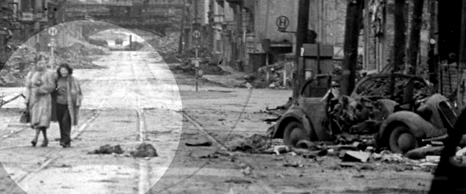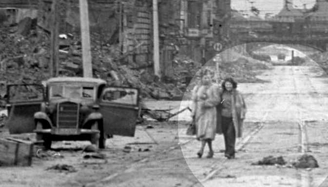 Gut lässt sich vorstellen, daß eine der beiden Frauen tatsächlich die spätere Zeugin ist. Kleidung und die Tatsache, daß sie auf der Strasse spazieren, lässt die Vermutung zu, daß sie in diesem Bereich ihre Wohnung haben und "mal schauen wollen", was nach dem Durchzug der Amerikaner in ihrem Umfeld so geschehen ist.