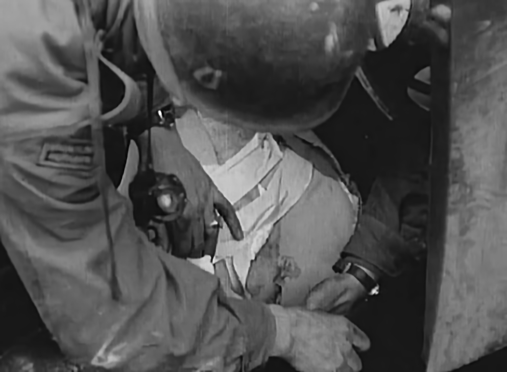 Die Frau hat offensichtlich schwere Verletzungen, die Soldaten legen sie auf die Seite und untersuchen ihren Rücken. Vor den Filmaufnahmen ist offensichtlich bereits eine erste Versorgung mit Notverbänden erfolgt, die man auf dem Bild erkennen kann. Zudem ist reichlich Blut auf dem Rücken verteilt.