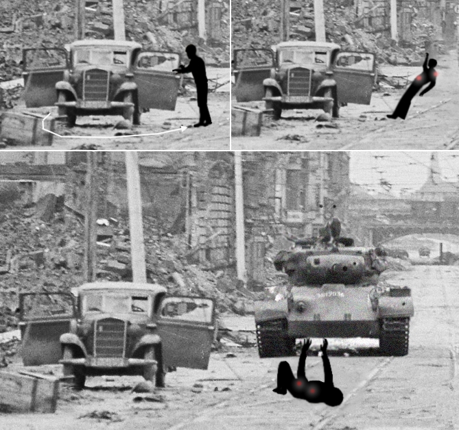 Und bei diesem Bemühen wurde die Frau dann angeschossen und fiel getroffen "seitwärts" neben das Auto. Dort lag sie mitten auf der Strasse und die in der Folge über die Strasse fahrenden Panzer müssen sie dabei einfach überrollt haben, wodurch die Frau zu den matschigen Körperresten mit Stiefeln auf der Strasse wurde.