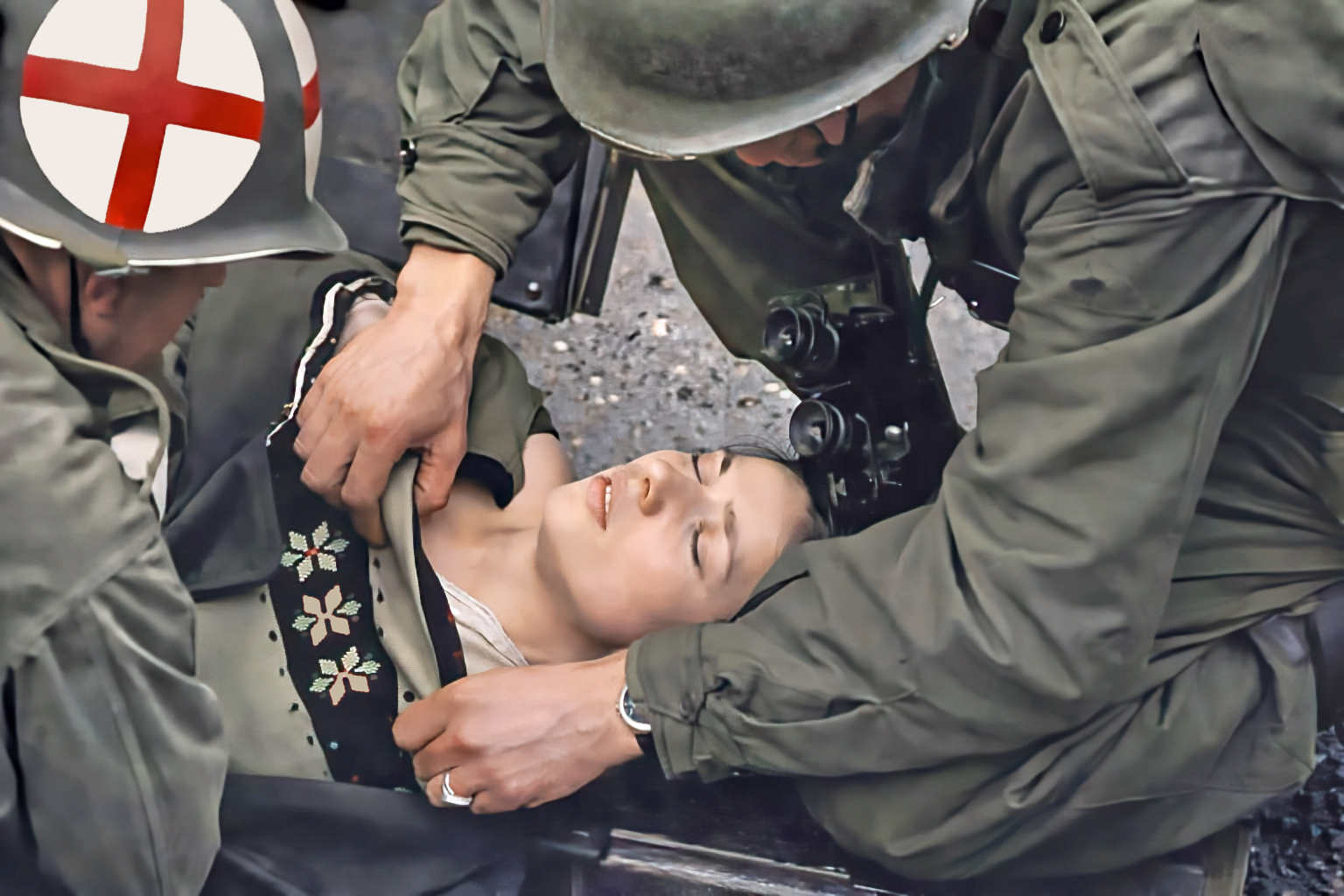 Die Frau hat offensichtlich schwere Verletzungen, die Soldaten legen sie auf die Seite und untersuchen ihren Rücken. Vor den Filmaufnahmen ist offensichtlich bereits eine erste Versorgung mit Notverbänden erfolgt, die man auf dem Bild erkennen kann. Zudem ist reichlich Blut auf dem Rücken verteilt.