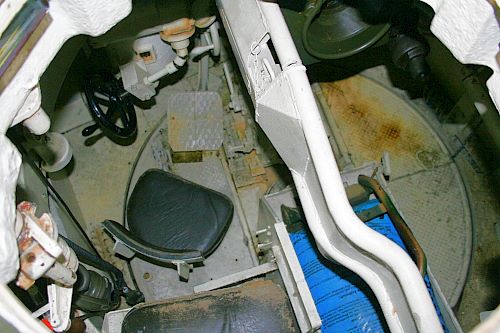 Blick aus dem Turm nach unten. Am unteren Bildrand der Sitz des Kommandanten, unten der Sitz des Richtschützen und rechts die Position des Ladeschützen.
