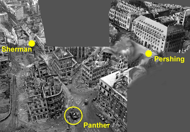 | Blick vom Dom auf die Kampfstätte. Photomontage aus drei verschiedenen Einzelbildern. Das Bild in größerem Format auch hier. Teile der Häuser zwischen Pershing und Panther habe ich unscharf gemacht, da ich für diesen Bildteil nur ein Vorkriegsbild hatte. |