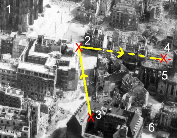 Bei der höheren Perspektive handelt es sich um den Standort des Kameramannes Bates, der das Panzerduell filmte und des Fotografen John W. Himes, der nach Beendigung des Kampfes von dort ein Foto des brennenden Panther machte. Beide befanden sich in dem Gebäude der Deutschen Arbeitsfront an der Ecke Marzellenstraße / An den Dominikanern und beide machten ihre Aufnahmen aus diesem Gebäude heraus. Das Haus gibt es auch heute noch und beherbergt nun das Kölner Sozialgericht. Von dort ergab sich damals ein guter Blick auf die Marzellenstraße und den deutschen Panther vor dem Dom.