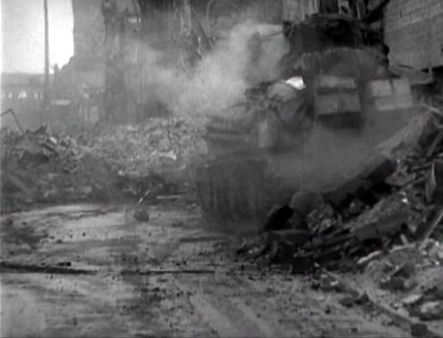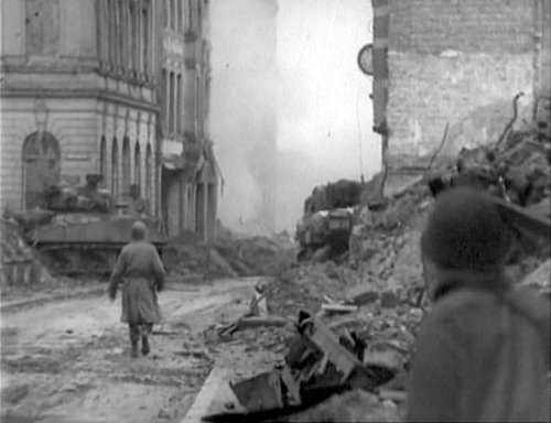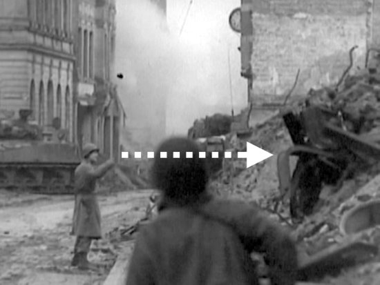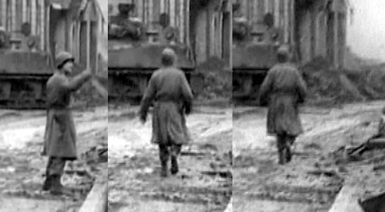 Dabei entsteht bei genauer Hinsicht eine weitere seltsam wirkende Filmszene. Sie wurde in der Komödienstraße gedreht, als Bartelborths Panzer wahrscheinlich bereits abgeschossen war, aber noch brannte. Zu sehen ist ein GI, wahrscheinlich ein Offizier, der sich hinter dem Heck des abgeschossenen Shermans befindet und zunächst in Richtung des deutschen Panzers blickt, als warte er auf ein Startzeichen, daß dort gleich etwas passieren wird. Dann erscheint im Hintergrund eine Rauchwolke. Die Explosion scheint werder den Kameramann noch den Offizier oder eine dritten einfachen Soldaten, der rechts ins Bild kommt, zu beunruhigen. Der GI im Mantel geht nun aufrecht und ohne Deckung einige Schritte vor und gestikuliert mit den Armen in Richtung des deutschen Panzers, so als wolle er jemanden zurück rufen. Man hat nicht den Eindruck, daß der Offizier befürchtet, aus Richtung des deutschen Panzers selbst beschossen zu werden. Genau so wenig wie der einfache Soldat rechts im Bild. Desinteressiert vom Geschehen wendet er seinen Blick sogar ab und dreht der Szenerie den Rücken zu. Dieser Mann fürchtet sicher nicht akut, beschossen zu werden.