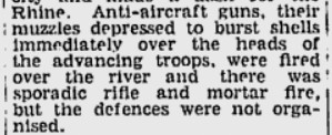 "Luftabwehr-Kanonen, deren Mündung herunter gedrückt war, damit die Granaten sofort über den Köpfen der vordringenden Truppen explodierten, schossen über den Fluß herüber und es gab sporadisch Gewehr- und Mörserbeschuß, aber die Verteidigung war nicht organisiert."