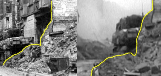 Aber meiner Meinung nach ist sogar nicht ausgeschlossen, eigentlich sogar noch wahrscheinlicher, daß der dort zu sehende Qualm von eingestürzten Teilen eines der Häuser im Bereich des zu sehenden Trümmergrundstücks stammen könnte. Dies könnte die Folge des vorhergehenden Beschusses durch den Panther aus dem Bahnhofsbereich in Richtung Komödienstraße gewesen sein. Der Panther könnte dabei z.B. auf den zweiten Sherman gezielt haben und dabei Trümmer oder eine Hauswand auf dieser Straßenseite getroffen haben. Das hätte dann dazu führen können. das aus dieser Häuserlücke heraus Qualm aufsteigt.