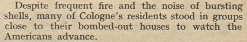 "Trotz häufiger Schüsse und den Geräuschen berstender Granaten standen viele Kölner Einwohner in Gruppen bei ihren ausgebombten Häusern um den Vormarsch der Amerikaner zu beobachten"