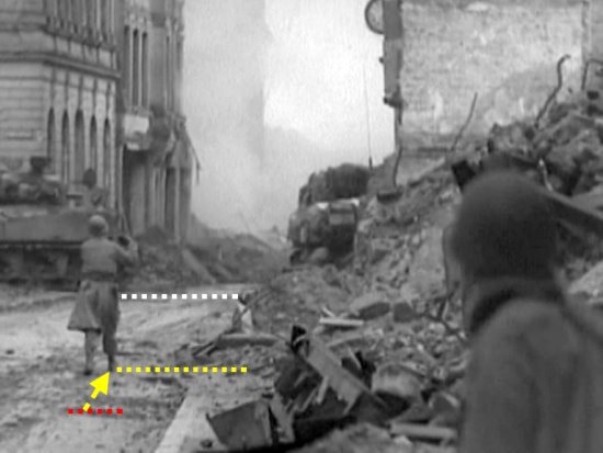 Nun ist klar, wohin der Soldat auf der Straße geht und wem er zu gestikuliert, er solle (zurück) kommen. Die Feststellung Rheindorfs, der Soldat winke jemanden am deutschen Panzer zurück, entpuppt sich damit endgültig als nicht haltbar. Was dies für ein Soldat ist, ein Mitglied der Sherman-Besatzung, welches aus dem Sherman fliehen konnte, also Gialluca, Griffin oder Kellner oder ein Soldat, der zu Hilfe gekommen ist oder nachschauen sollte, wie die Lage am Sherman ist, kann nicht genau gesagt werden. Alle 3 Möglichkeiten sind denkbar. Fakt ist, daß die Trümmer hinter dem Sherman so unglücklich lagen, daß ein Soldat, der sich aus dieser vorderen Kampflinie zurückziehen wollte, über die Straße gehen mußte. Er konnte kaum über die hohen Trümmer klettern, vor allem nicht, wenn er verletzt war oder wenn ein Verletzter transportiert werden sollte.