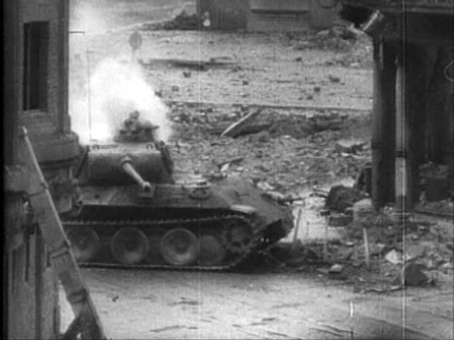 Nach so vielen Erkenntnissen an dieser Stelle noch ein paar Sätze zur Frage, inwiefern die Soldaten dort überhaupt Beschuß fürchten mußten. Der Soldat rechts im Bild stand in Deckung der Häuserzeilen vor ihm sowie des abgeschossenen Sherman. Zudem befanden sich auf der Komödienstraße größere Schuttberge, die Richtung Dom und damit den Deutschen eine Art Schutzwall bedeuteten. Bartelborth, der Kommandant des Panther, hatte vor seinen Schüssen auf die Shermans in der Komödienstraße nur die Kuppeln der amerikanischen Panzer gesehen, wie er es später in einem Brief schrieb. Die Kuppeln befinden sich aber in einer Höhe ab ca. 1.80 bis 2 m über dem Boden, Personen unterhalb der entsprechenden Körpergröße dürften somit von deutscher Seite aus kaum zu sehen gewesen sein. Die Trümmer auf der Straße haben somit auch eine sehr gute Sichtbeeinträchtigung der Deutschen dargestellt und damit einen guten Sichtschutz für die amerikanischen Soldaten auf der Komödienstraße. Ausschnitt eines Bildes von George Silk, Life Magazin Ein Foto mit dem bereits brennenden Panther. Deutlich ist, wie hoch die Trümmer auf der Straße liegen. Sie boten einen kleinen Schutz auch für Soldaten auf der Komödienstraße.