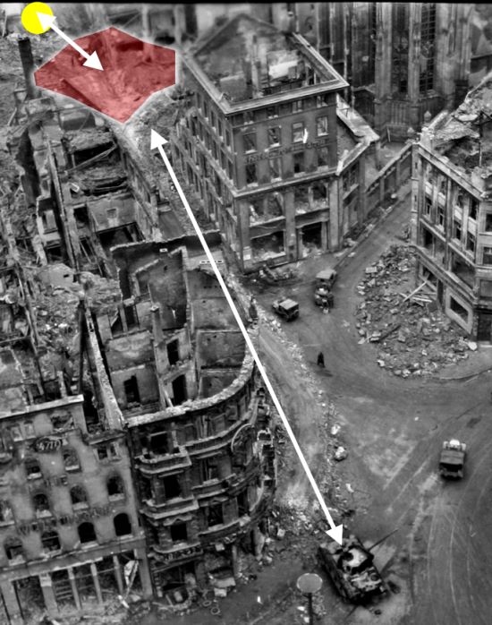 Schaut man sich zunächst die räumliche Situation einmal näher an, sieht man, daß der im Bereich der Lücke zwischen den zerstörten Gebäuden hängende Qualm sich sehr viel näher am Sherman als am Panther befindet: Blick vom Dom, im Vordergrund der Panther, oben mit gelbem Punkt markiert die Position des Sherman. Der Bereich, wo im Film die Qualmentwicklung in der Filmszene zu sehen ist, ist rot markiert. Der Qualm ist also räumlich näher am Sherman als am Panther. Zudem fällt auf, daß der Rauch noch sehr dicht ist und starke Konturen bzw. vergleichsweise stabile Ränder hat. Rauch verteilt sich aber bei zunehmender Entfernung von der verursachenden Quelle immer mehr, wird lichter und konturloser. Es erscheint daher hier unter Berücksichtigung der Entfernung des Qualms zu Panther bzw. Sherman wahrscheinlicher, daß es sich um Qualm handelt, der am oder in der Nähe des Sherman entstanden ist.