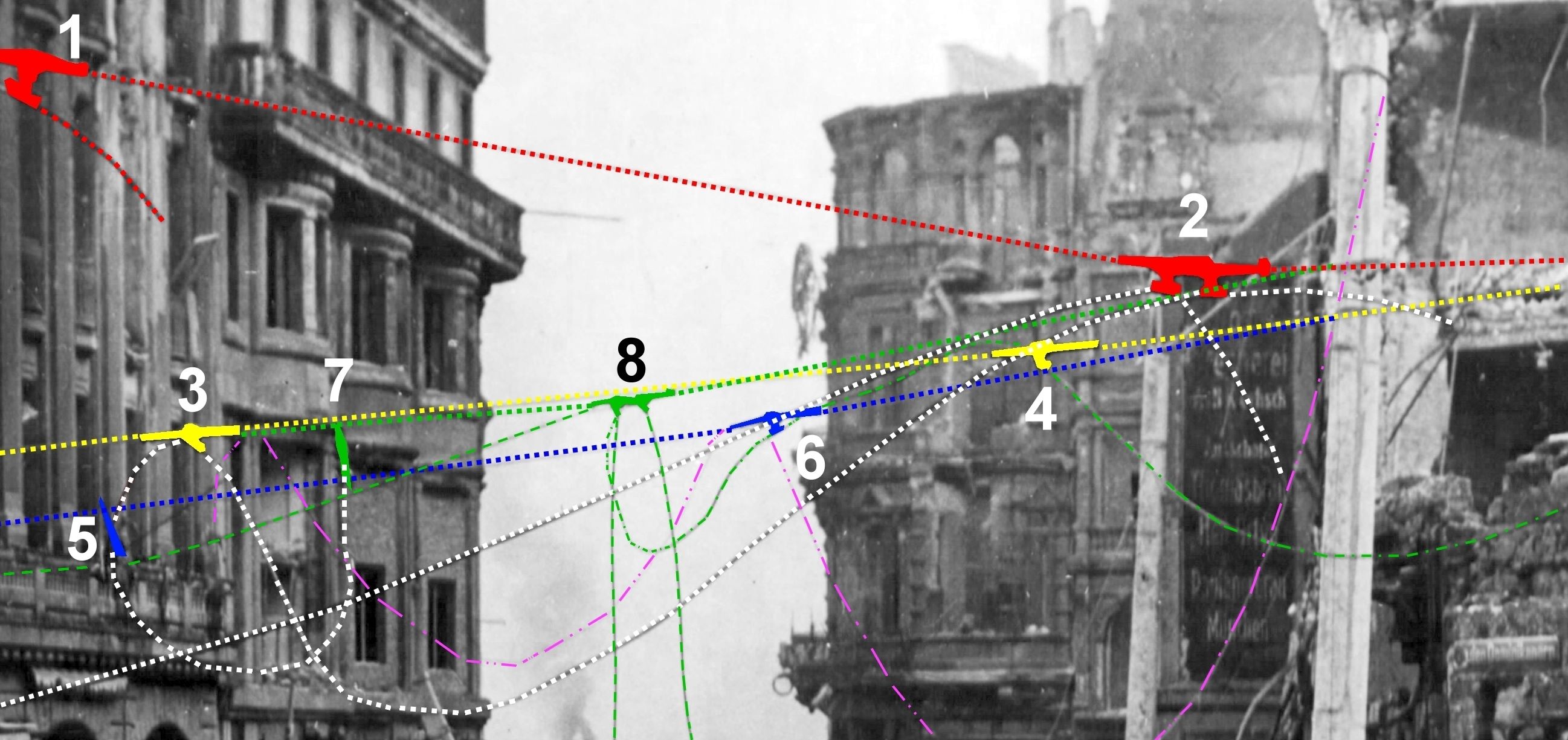 Quer durch das Bild verläuft noch ein rosa markierter Draht vom rechten Mast über den Aufhänger (6) zum Aufhänger (3), wo sich die Spur verläuft. Die Funktion dieses Drahtes ist nicht ganz eindeutig. Vermutlich ist es aber ein ursprünglich noch über den Trägerseilen hängendes Spannseil, welches über der Kreuzung verlief, um die Oberleitungen im Kurvenbereich auf der gegenüberliegenden Seite zu sichern (Marzellenstraße Richtung Eigelstein / Bahnhofstraße) und nun aufgrund der Zerstörungen im Oberleitungssystem auf die Trägerseile heruntergefallen ist. Dafür spricht jedenfalls der in Wellen von Trägerseil zu Trägerseil gehende Verlauf dieses Seiles. Oberleitungen in Kurvenverläufen wurden seinerzeit regelmäßig von der gegenüberliegenden Straßenecke abgespannt, wie später auf einer Grafik auch noch einmal zu sehen sein wird.