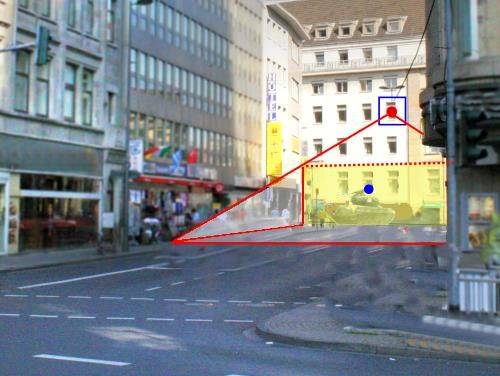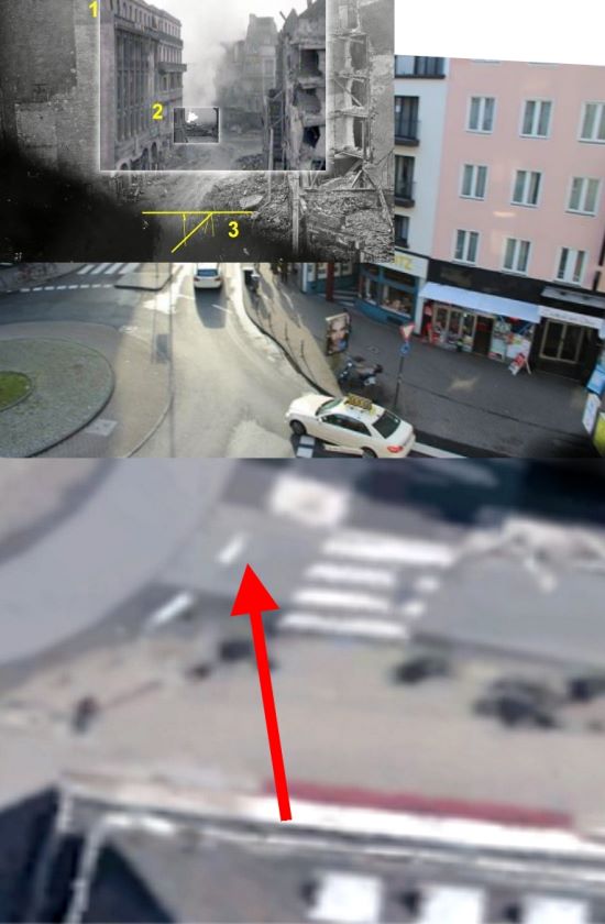 Das Foto wurde von Florea aus der Marzellenstrasse Richtung Eigelstein heraus aufgenommen. Bates und Himes schauten aus dem Haus der Deutschen Arbeitsfront von weiter Rechts auf diese Kreuzung, die Hausmauer links von dem in der Bildmitte sichtbaren Pfahl verläuft quasi direkt auf deren Position zu.