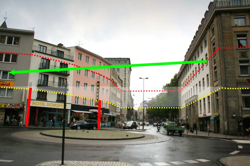 Die Kreuzung aus Richtung Bahnhofstraße gesehen - heute. Rechts damaliges Haus der Deutschen Arbeitsfront, Blick geradeaus in die Straße An den Dominikanern, nach links das Stück Marzellenstraße, an derem Ende der Panther stand. Gelb gepunktete Linie ist die Höhe der damaligen Oberleitungs-Befestigungen an den Häusern. Die rot gepunktete Linie ist die Höhe, in der Bates und Himes ihre Kameras hielten, als sie in der dritten Etage des Hauses der deutschen Arbeitsfront standen. Ihr Blickwinkel wird mit dem grünen Pfeil dargestellt. Leicht weiß schattiert die Ebene, in der über der Kreuzung hängende Oberleitungen sich befunden hätten, wenn sie in exakt der gleichen Höhe gehangen hätten, wie die Befestigungen an den Wänden. Aber natürlich muß man zum einen noch das natürliche Durchhängen der Oberleitungen berücksichtigen ....
