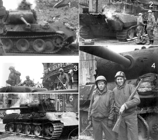 Im Gegensatz zu den anderen 4 Bildern der Montage. Dort sieht man einen ausgebrannten Panzer. Es sind Bilder des Panther vom 7. März, als dort ein Pressetermin mit Soldaten des Pershing stattfindet. Ja, so stellt man sich einen ausgebrannten Panzer vor, schwarzer Aussenhaut, abgeplatzte Farbe, Asche, eingefallene Panzerketten.