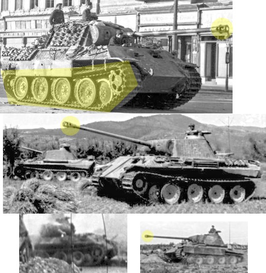 Schauen wir uns nun einen Panther genauer an, denn die deutsche Crew wollte ja einen deutschen Panzer erkannt haben, der da um die Ecke kam. Quelle: Bundesarchiv, Bild 101I-478-2164-39 / Bayer / CC-BY-SA, Bild 101I-733-0030-20 / Sieg / CC-BY-SA; Bild 101I-244-2306-14 / Bauer / CC-BY-SA