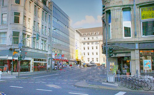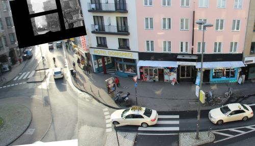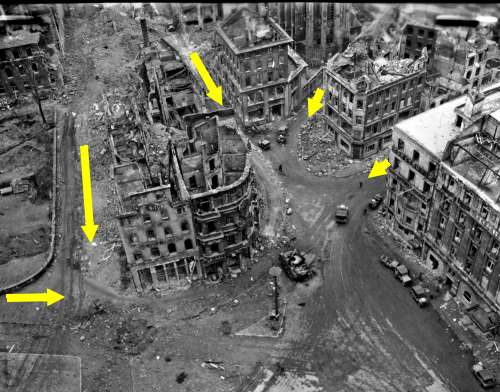 Etwa diesen Blick hatte die Panther-Besatzung auf den hinten an der Kreuzung auftauchenden Pershing-Panzer. Das Eckhaus links gab es damals schon, ebenso die rechte Häuserzeile mit dieser Häuserecke und hinten das Gebäude der Deutschen Arbeitsfront, aus dessen 3. Etage Bates filmte. Davor steht in etwa maßstabsgerecht ein Panzer Typ Pershing. Die damaligen hinteren Häuser der linken Häuserzeile waren damals natürlich mehr oder weniger stark zerstört, dennoch dürfte der Sichtbereich in Richtung Kreuzung so groß gewesen sein, wie auf dieser Bildmontage, denn die Ruinen an der Ecke erreichten sicherlich eine Höhe von mindestens 3 Metern, so daß der Pershing sie nicht überragen konnte.