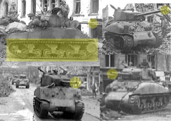 So einen Panzertyp haben die deutschen Soldaten in diesem Moment erwartet. Einen amerikanischen Panzer vom Typ Sherman. Es gab verschiedene Varianten des Shermans, jedoch gab es bei allen ein spezielles Laufwerk, wie man es oben im Bild markiert sehen kann. In der Regel verfügten die Sherman auch nicht über eine auffällige Mündungsbremse, an der Spitze des Kanonenrohrs gab es also keine gut sichtbare "Verdickung". Insgesamt wirkte der Sherman von seinen Aufbauten her auch eher etwas rundlich.