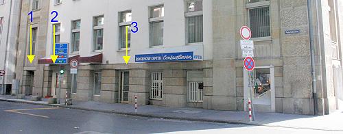 Ein Foto aus August 2008 von der Hausseite, wo sich der "entspannte" Soldat damals aufgehalten hat. Heute befinden sich in diesem kurzen Abschnitt alleine drei Türen (1 - 3). Ob alle drei Türen auch schon 1945 vorhanden waren, ist nicht bekannt. Türe (1) sollte aber auf jeden Fall da gewesen sein, da es sich um das Treppenhaus handelt. Es ist also zu vermuten, daß der Soldat sich extra im Umfeld diese Tür(en) aufhielt und möglicherweise auf die sich zu diesem Zeitpunkt im Hause befindlichen Personen wartete bzw. diese dorthin begleitet hatte.