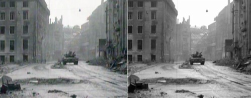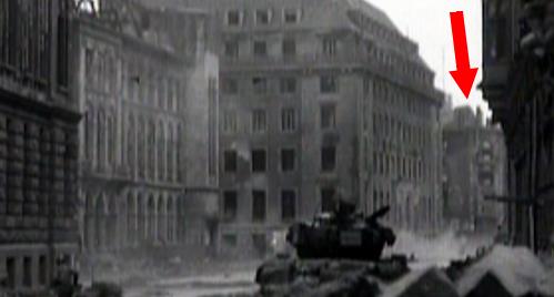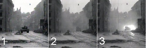 Bild 1, Filmszene, wo Pershing angeblich Richtung Kreuzung fährt, Kreuzung nur leicht dunstig. Im Originalfilm folgt nun ein Bildschnitt. Es geht dort mit Bild 2 weiter, kurz vor dem Abschuß. Gegenüber Bild 1 steht sehr viel mehr Qualm in der Kreuzung. Foto 3 während des Abschusses.