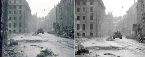 Selbst im Querformat ist der Dom vollständig im Bild, im Hochformat (wie das Originalbild von Fred Ramage vom getroffenen Sherman) wäre es noch weniger ein Problem. Die Aufnahme entstand Anfang Oktober, es war im Gegensatz zum 6. März 1945 ein trüber regnerischer Tag. Die Bildbelichtung erscheint deutlich verbesserungsbedürftig. Der helle Himmel hat die Beleuchtungsautomatik der Kamera dominiert und zu einer Abdunklung geführt, die Häuser- und Straßensituation wurde dadurch düsterer gestaltet. Aber kein Problem, was damals mit einer unterschiedlichen Belichtung des Fotopapiers im Fotolabor erreicht wurde, vollziehe ich mittels eines Grafikprogramms und einem einfachen Aufhellungseffekt, dies entspricht dem damaligen kürzeren Belichten von dunkleren Bildteilen, welches zu einer Aufhellung dieser Bildteile führte: