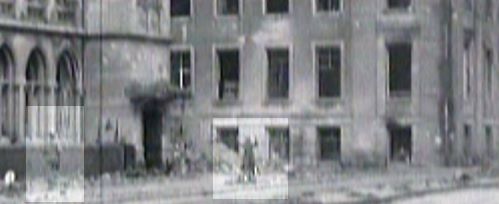 Und hinsichtlich der guten gleichmäßigen Schärfe des Bildes: nun auch das ist kein großer Zauber. In dem (hier auf dieser Seite nicht gezeigten) vollständigen Originalbild der Aufnahme von Ramage nach dem Beschuß sind - wie oben bereits erwähnt - auch noch die kompletten Domtürme mit zu sehen. Die Aufnahme muß an diesem Standort unweit des Domes also mit einem Weitwinkelobjektiv aufgenommen worden sein. Bei einem Weitwinkelobjektiv ist die Schärfentiefe eines Bildes aber kein größeres Problem. Mit fast allen Entfernungseinstellungen bekommt man bei einem Weitwinkelobjektiv in der Regel problemlos alle sichtbaren Objekte im Bild - ob nah oder fern - scharf gestellt. Dies ist eine Eigenheit der Weitwinkelobjektive und ist bei Normalobjektiven oder Teleobjektiven so nicht der Fall.