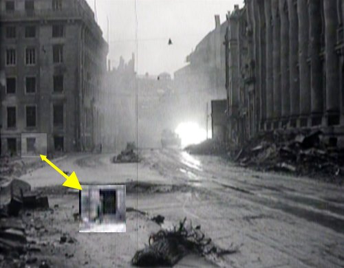 Beide Bilder zeigen nun fast ausschließliche Übereinstimmung. Es scheint beide Male exakt der gleiche Standort des Kameramannes zu sein, auch der Pershing fährt an der fast exakt gleichen Stelle, was wirklich ziemlicher Zufall wäre, wenn der Pershing bei Hin- und Rückfahrt so exakt die gleiche Stelle treffen würde, denn beim gefilmten Abschuß steht er sehr viel weiter rechts, konnte also nicht eine grade Linie gefahren sein. Auf beiden Bildern scheint der Qualmgehalt der Luft im Kreuzungsbereich gleich zu sein, obwohl in anderen vorher aufgenommenen Filmszenen die im Hintergrund sichtbare Kreuzung sehr viel klarer erscheint, so daß hier eigentlich bei einer Hinfahrt-Szene vor den Abschüssen durch den Pershing klarere Sicht herrschen müßte als bei einer Rückfahrtszene nach den Abschüssen . Schließlich fällt bei der Betrachtung der Filmsequenz der angeblichen Hinfahrtszene noch etwas auf. Von links bewegt sich in dieser kurzen Filmszene ein kleiner Gegenstand auf den Pershing zu, beginnend mit kleiner Geschwindigkeit und dann schneller werdend. Die Qualität des VHS-Materials für ein Standbild ist nicht sehr gut, aber in den folgenden verschiedenen Bildausschnitten kann man diesen sich bewegenden Gegenstand zumindest erahnen, im Film auf dem Computer oder dem Fernseher auch sehr gut sehen