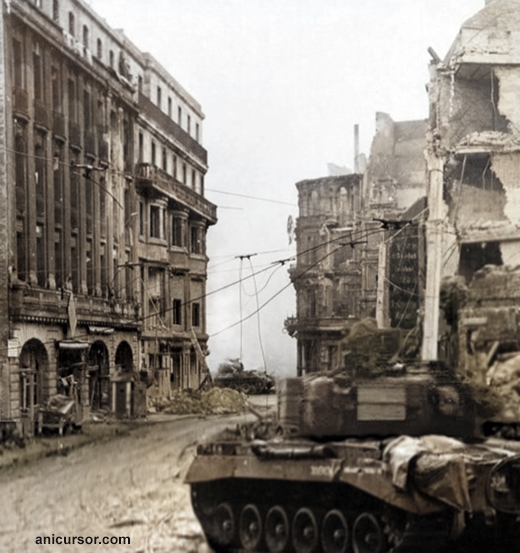 Cologne, Germany, March 6, 1945. The 3rd Armored Division tanks advance on the Cologne center and the cathedral. It's about 2 pm. The following minutes will produce some of the most dramatic combat images to come out of WWII. This page will show you the famous tank battle at the Cologne cathedral. |