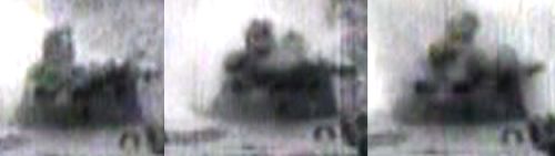 Fig. 4: In three frames one can see a falling object. It seems to be the German tank commander, who had rolled out of the turret. Here is one of the two blurred frames. | |  Fig 5: And here the only one sharp frame showing the falling tank commander, one can see his legs, he is falling headfirst. |