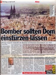Im folgenden Artikel äußert das Besatzungsmitglied eines Bombers, welcher am 2. März 1945 den Angriff auf Köln mit flog, Verwunderung, daß der Dom nach all den Kriegsjahren noch steht. Es findet sich kein Hinweis des Augenzeugen, daß man ihn nun gezielt zerstören sollte. Dieser Hinweis hätte sich im Zusammenhang mit der Verwunderung aber geradezu aufgedrängt - falls es tatsächlich so gewesen wäre, daß er ein konkretes Ziel gewesen wäre: