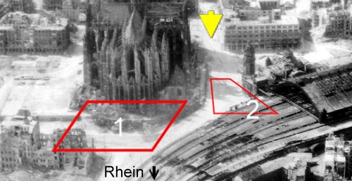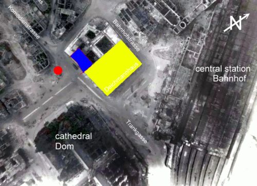 Die örtliche Beschreibung liegt auch nicht so weit auseinander, wie sie zunächst erscheint. Roter Punkt ist die Position des abgeschossenen Panther. Hotel Excelsior ist das blau markierte Gebäude. Insofern findet Kleff die Positionsbeschreibung "vor dem Excelsior". Gelb markiertes Gebäude ist das Deichmannhaus. Eine Position zwischen Dom und Deichmannhaus war also nicht sehr weit von der Position vor dem Excelsior entfernt. Es ist eher unwahrscheinlich, daß hier zwei Panzer standen, der Panther sozusagen 50 m voraus Richtung Feind in der Schußlinie eines "Tiger".