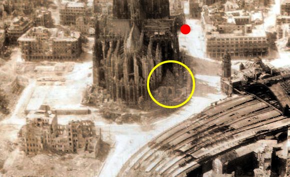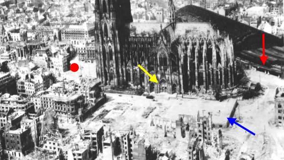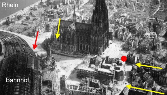 Schauen wir auch auf die andere Seite des Doms, die nördliche Seite: Dieses Bild zeigt den nördlich des Doms gelegenen Bereich. Roter Punkt ist der Standort des abgeschossenen Panther an der Komödienstraße. Linker gelber Pfeil zeigt die Sakristei des Doms, links davon mit rotem Pfeil markiert der Tunnel Trankgasse. Rechte gelbe Pfeile zeigen die Zugrichtung der vorrückenden Amerikaner. Das Bild macht deutlich, daß die Sakristei einen guten und geschützen Ausblick auf diesen Bereich nordöstlich des Doms und insbesondere der Unterführung bot. Ein weiterer Panzer an oder in der Unterführung hätte mit schießenden Amerikanern am dortigen Fenster aber sicher kurzen Prozess gemacht.