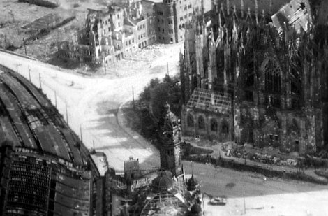 "Um 12.50 Uhr begannen die Deutschen mit der Sprengung der Hohenzollernbrücke. ... Auch bei der Sprengung der Geleise im Hauptbahnhof, die nach der Sprengung der Brücke erfolgte, nahm der Dom keinen Schaden. Nun kam der Kampf schnell näher. Bald erschien auf dem Domplatz ein größerer deutscher Panzer, der immer wieder durch die Kleine Marzellenstraße zwischen Domplatz und unter Sachsenhausen hin und her fuhr. Schließlich traf ihn ein feindliches Geschoß, er brannte vor dem Hotel Exelsior aus."