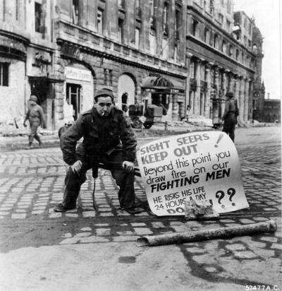Auch in den nachfolgenden Wochen war der dortige Rheinufer-Bereich wegen der deutschen Truppen auf der anderen Rheinseite noch Sperrgebiet. Foto veröffentlicht auf der Webseite footnote.com, entstammt dem Archiv NARA. Hier eines der vielen in der Innenstadt aufgestellten Warnschilder, die diesen Sperrbereich entlang des Rheins markierten.